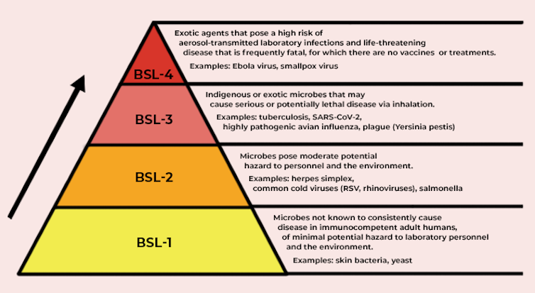 A comunidade de pesquisa reconhece quatro níveis de práticas de biossegurança. A biossegurança nível 1 (BSL-1) e BSL-2 são aplicadas em espaços de laboratório gerais onde há baixo ou nenhum risco. Eles não trabalhariam com microrganismos que representam uma séria ameaça para pessoas ou animais.